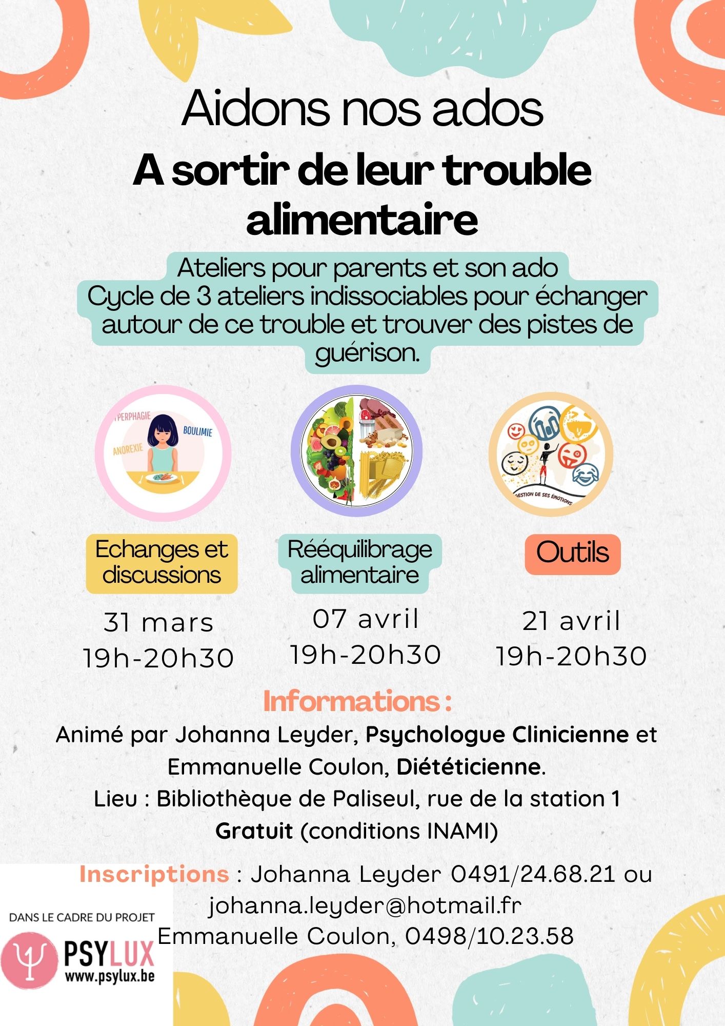 Si vous êtes intéressés, vous pouvez prendre contact avec Mme Leyder Johanna, psychologue : +32 491 24 68 21 ou avec Madame Coulon : +32 498 10 23 58 Dates : 31/03, 07/04 et 21/04/2026 en soirée (de 18h30 à 20h) à la bibliothèque de Paliseul