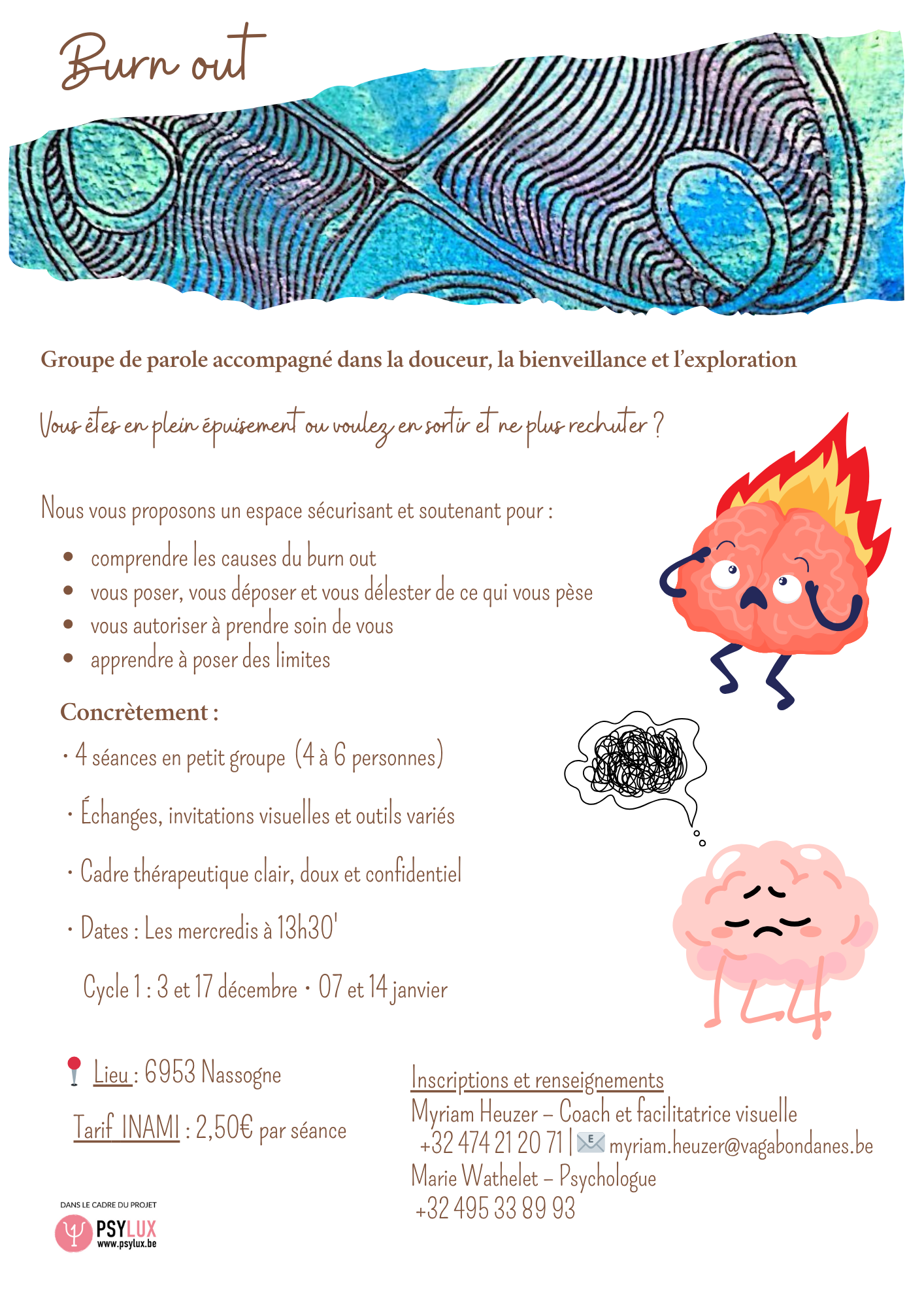 Cycle de 4 séances : 3/12, 17/12/2025 et 07/01 et 14/01/2026 (les mercredis à 13h30) Informations et inscriptions : Wathelet Marie, psychologue : +32 495 33 89 93