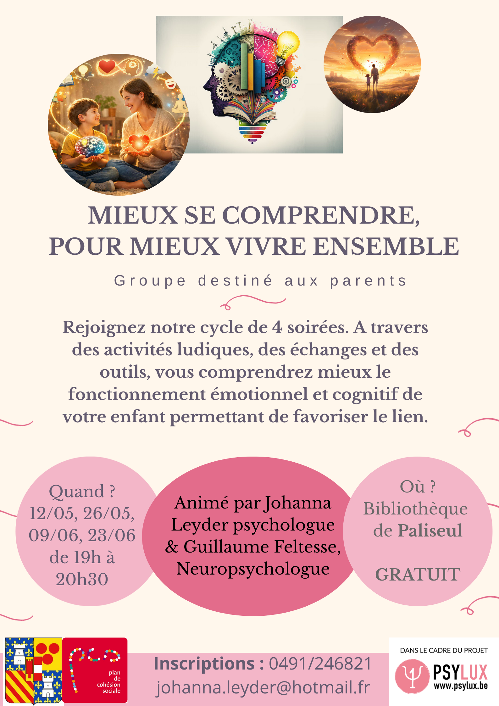 Quand ? 12/05, 26/05, 09/06 et 23/06/2026 de 19h à 20h30 Où? à la Bibliothèque de Paliseul Animé par johanna Leyder, psychologue et Guillaume Feltesse, neuropsychologue Info et inscriptions : 0491/24 68 21 ou johanna.leyder@hotmail.fr