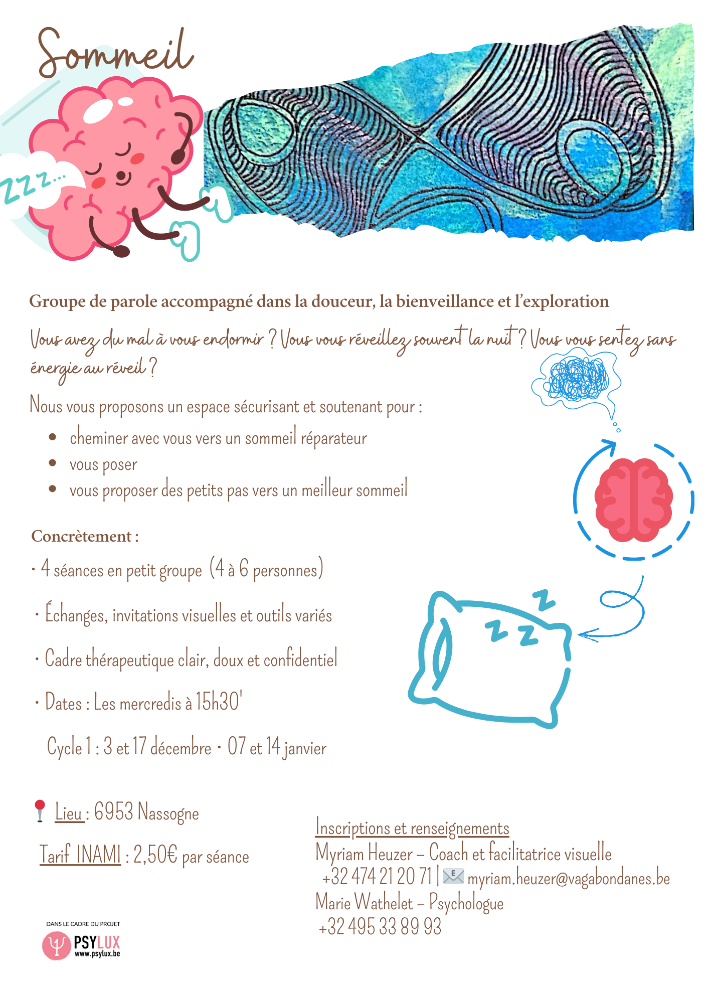 Cycle de 4 séances : 3/12, 17/12/2025 et 07/01 et 14/01/2026 Informations et inscriptions : Wathelet Marie, psychologue : +32 495 33 89 93