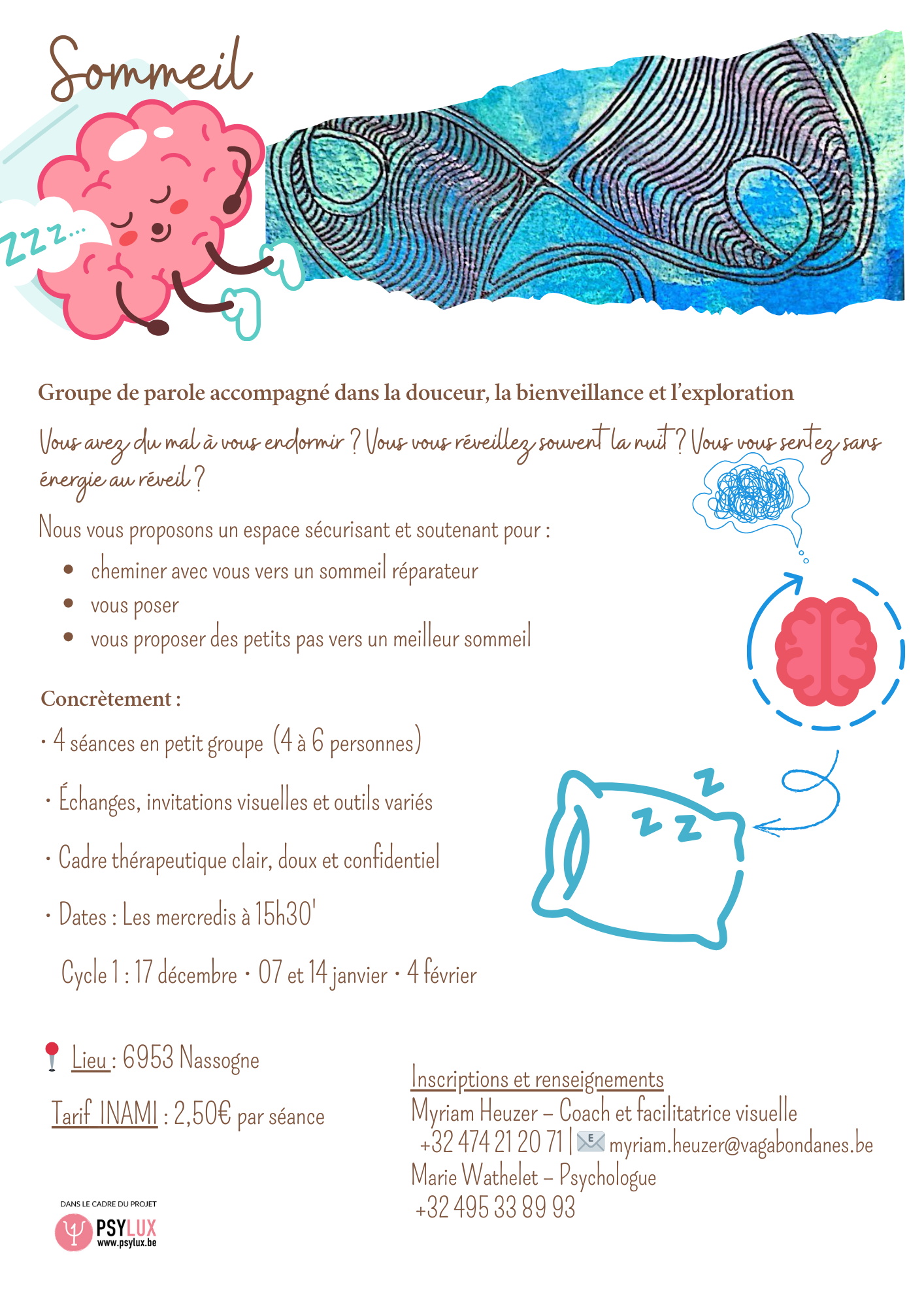 Cycle de 4 séances : 17/12/2025, 07/01, 14/01/2026 et 04/02/2026 Informations et inscriptions : Wathelet Marie, psychologue : +32 495 33 89 93 Myriam Heuzer, coach et facilitatrice visuelle : +32 474 21 20 71 ou myriam.heuzer@vagabondanes.be