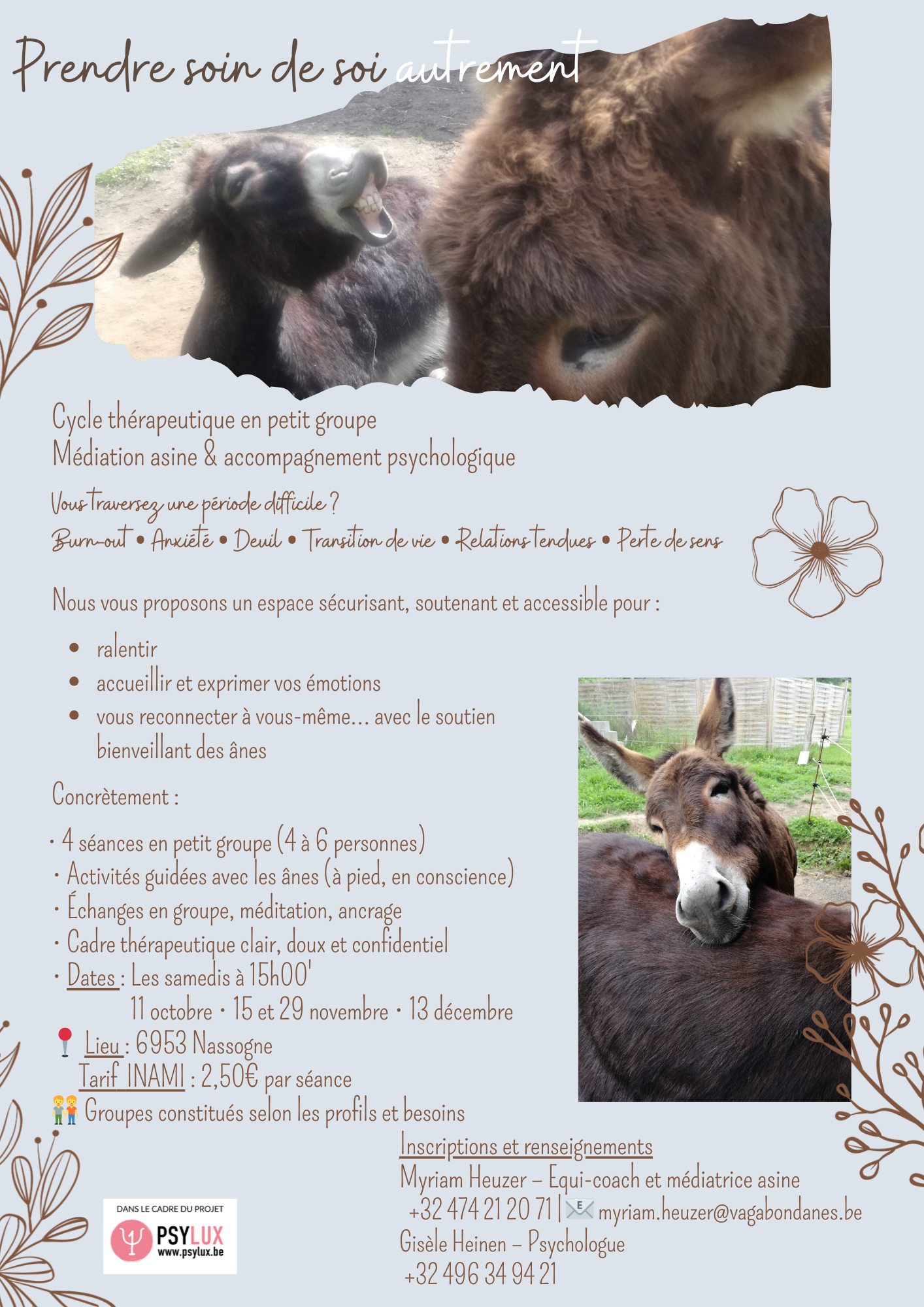 Cet atelier est un soin donné, par l’intermédiaire d’un animal, précisément un âne, aux personnes en souffrances physiques ou mentales. La médiation asine réside dans les objectifs de travail (gestion des émotions, du stress, burn-out, dépression, estime et confiance en soi, …) et les moyens utilisés pour y parvenir (soin et contact à pied avec l’animal dans différents contextes).