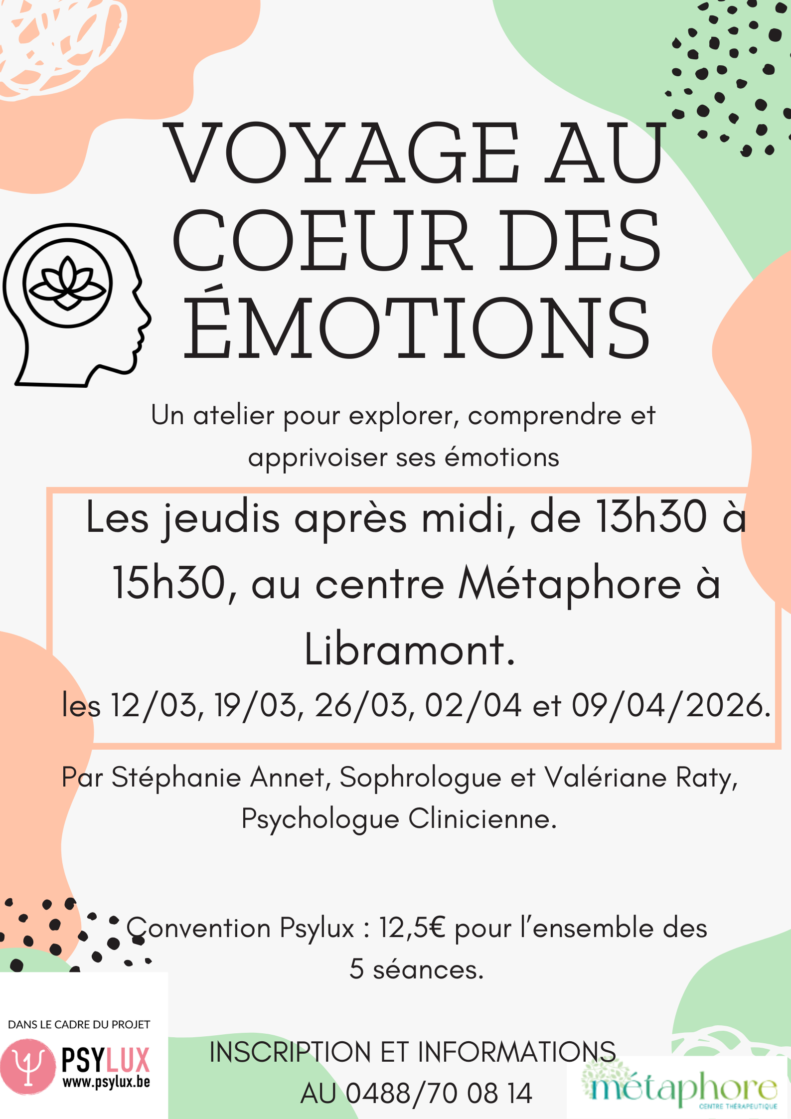 Apprendre à mieux reconnaître ses émotions Explorer les liens entre émotions, pensées et comportements Découvrir des techniques de gestion émotionnelle adaptées à ses besoins S'exprimer librement dans un cadre sécurisé, soutenu par un groupe solidaire À travers des outils issus de la psychologie et de la sophrologie, nous vous accompagnerons dans ce processus de transformation. Des exercices pratiques, des moments de partage et de réflexion vous permettront de développer de nouvelles ressources pour aborder vos émotions avec sérénité.